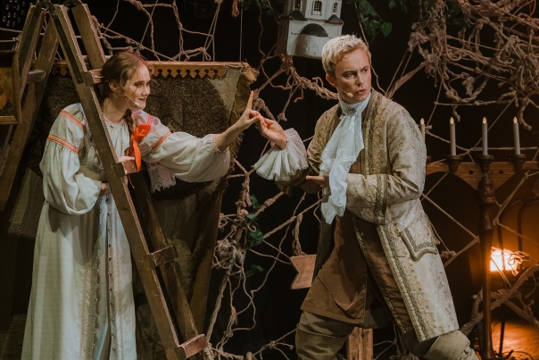 Плюсы этого спектакля - в отличной актерской игре и в правильном подборе актеров. Юная пара Алиса Тарасенко и Марк Кондратьев выглядит свежо и трогательно. Юрий Голубцов в роли рассказчика Леонида - мужчина в возрасте, эдакий добрый дядюшка-резонер. Ирина Морозова, исполнительница роли матери Лизы, стала не просто матерью одного персонажа спектакля, но, кажется, еще и символом матери-родины, которая и приголубит, и поможет.